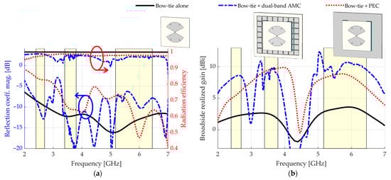 The CST transient solver was used to simulate the device fed by a waveguide port placed at the input of the SMA connector. The reflection coefficient magnitude and the broadside realized gain are also shown in Figure 13. For comparison purposes, a simulation in which the dual-band AMC is substituted by a PEC reflector of same total area, placed at the same distance over the antenna, was also performed. In addition, we repeat in Figure 13 the results for the standalone bow-tie. We also took advantage of this moment to simulate the radiation efficiency of the studied devices.