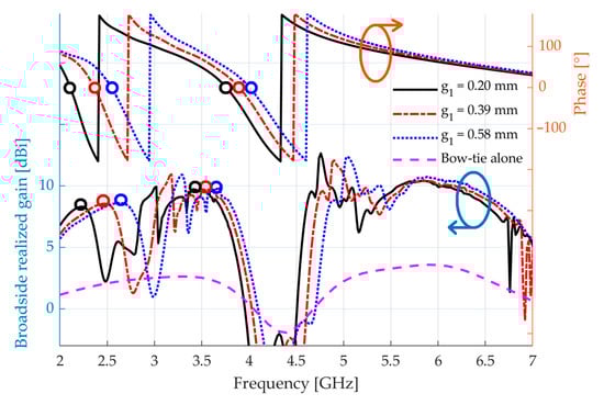 In what follows, we show that, for a fixed spacing between the AMC and the radiating element, the performance of the whole structure is mainly controlled through changes in the AMC design, as long as the radiating element works well in the operating frequency bands. In Figure 14, a variation in is shown. As increases, the peak of broadside realized gain around the LB significantly shifts upward. The same happens for the peaks around the MB and the UB, but in a soft manner. In the MB, the broadside realized gain is limited by the performance of the antenna, whose gain presents a drop around . The behavior seen in Figure 14 agrees with that seen in Section 2.2 when the gap is varied, confirming that the AMC controls the performance of the whole device. Figure 14 also shows the phase difference in the plane located over the unit cell, which relates to the distance between the AMC and the bow-tie in the final device. The gain peaks do not occur at the same frequencies at which . This happens because is calculated in conditions of normal incidence of TEM waves and infinite dimensions of the AMC. In the case of a finite-array AMC over which an antenna is located:
