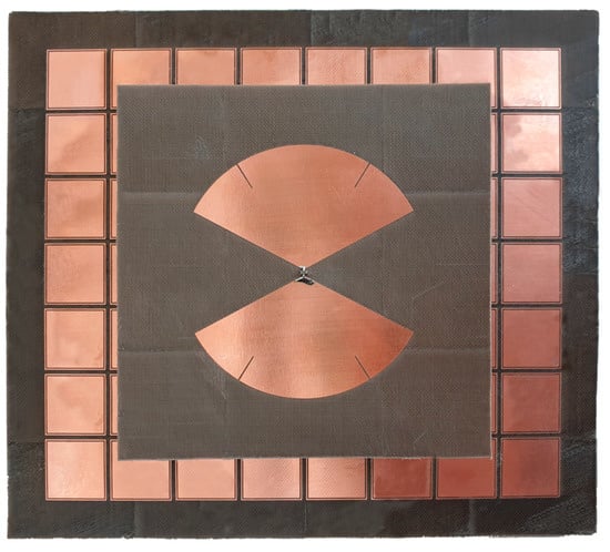 Next, the bow-tie defined in Table 2 was etched on an Arlon DiClad 880 substrate layer whose thickness is 0.76 mm, with relative permittivity and . A 4.9 mm thick AMC composed of 7 × 8 cells defined in Table 1 was modeled with two sheets of Arlon DiClad 870 material, each one measuring 160 × 142 × 2.45 mm3, , and . Figure 12 shows the final CST design.