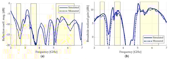 Figure 16b shows the measurement of broadside realized gain, in which a particularly good agreement with simulations is seen again. The following ranges of values were achieved in the measurements for the LB, MB, and UB bands, respectively: 7.4–8.0, 7.6–9.1, and 8.8–10.5 dBi. In the simulations, the ranges were 8.0–8.6, 8.1–9.8, and 8.1–10.7 dBi. The measured broadside realized gain shows 3 dB bandwidths of 34.4% for the lower operating band (from 2.00 to 2.83 GHz), 19.7% for the middle band (from 3.20 to 3.90 GHz), and 31.0% for the upper band (from 4.90 to 6.70 GHz), which means that the antenna, in addition to being multiband, is also wideband.