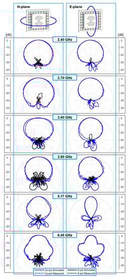 Figure 7 shows the simulated results for the standalone antenna. From 2.40 GHz, the reflection coefficient magnitude is . A better could be achieved by increasing the length of the radiating parts, at the cost of hampering the broadside realized gain at high frequencies, or by using a matching circuit. However, since this study is focused on the broadside realized gain and the pattern stability within each frequency band of interest, this reflection coefficient magnitude is considered satisfactory. The broadside realized gain is above 2 dBi from 2.40 to 6.45 GHz, except for a drop around 4.40 GHz, which is mainly due to the insertion of the grooves. The antenna is suitable for the final structure because this drop is outside the bands of operation.