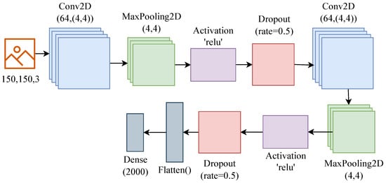In deep learning algorithms, a CNN is a kind of network architecture that is used specifically for tasks such as image recognition [30]. The CNN is extensively used in disease diagnosis [31], speech recognition [32], object classification [33], and fault detection [34]. A CNN needs to simplify the images without removing important details in order to provide reliable results [35]. CNNs classify images using specialized convolution and pooling operations while being computationally efficient. In a conventional CNN, there are four layers: (1) a convolution layer; (2) a pooling layer; (3) an activation layer; (4) a fully connected layer with a linearly corrected activation [36]. We used the CNN for feature extraction from the images [37], and the architecture of the used CNN model is represented in Figure 3. The input image size for the CNN was 150 × 150 × 3, followed by a 4 × 4 pooling size [38], Rectified Linear Activation Function (ReLU), and a 0.5 dropout rate [38]. These same layers’ patterns repeated two times made the CNN architecture deeper to extract the significant features. Following the CNN layers, we used the flatten layer to convert the 2D data into 1D [36], and in the end, we used a dense layer with 200 neurons, which will help to extract 2000 features from each image.