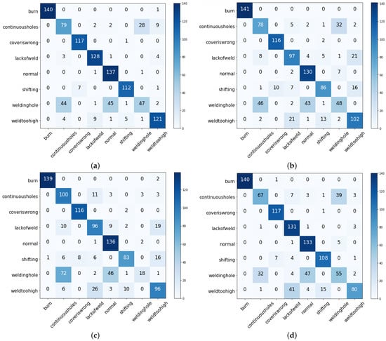 The imbalanced dataset was also used to evaluate the efficacy of transfer deep learning models. In terms of total fault detection accuracy, the studies revealed that the CNN model performed best, with a 65% accuracy rate (Table 7). Accuracy was high for the DenseNet-211 and MobileNet-V2 models. Poor results (accuracy of 41%) were achieved by both VGG-16 and ResNet-50. The CNN and MobileNet-V2 models achieved only a 100% precision score on the burn class, while the DenseNet-211 model achieved a 100% recall score on the cover is wrong class. Deep learning did not perform very well in detecting faults in battery making image datasets.