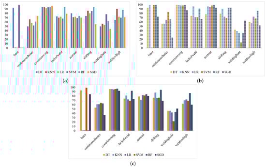Performance of ML classifiers: (a) represents the precision score, (b) represents the recall score, and (c) represents the F1 score.