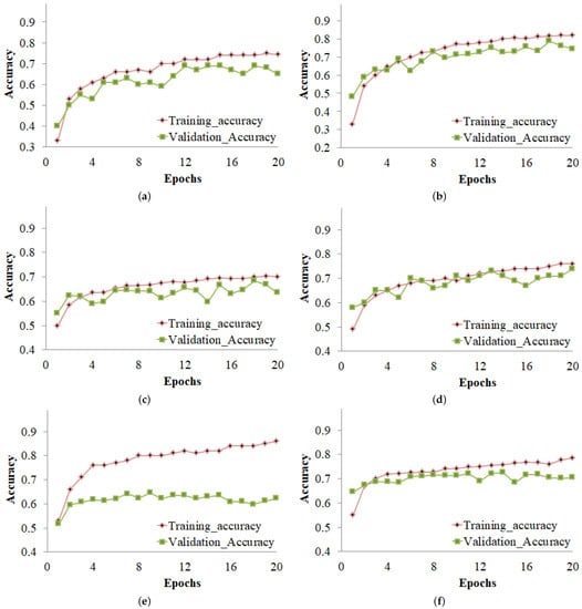 Training and validation accuracy of the (a) CNN model using the imbalanced dataset, (b) CNN model using the balanced dataset, (c) DenseNet-121 model using the imbalanced dataset, (d) DenseNet-121 model using the balanced dataset, (e) MobileNet-V2 model using the imbalanced dataset, and (f) MobileNet-V2 model using the balanced dataset.