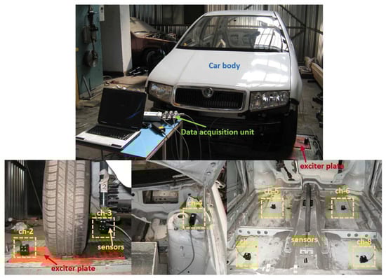Overall experimental set-up with exciter plate and data acquisition unit and locations of vibration sensors across the structure of the vehicle tested.