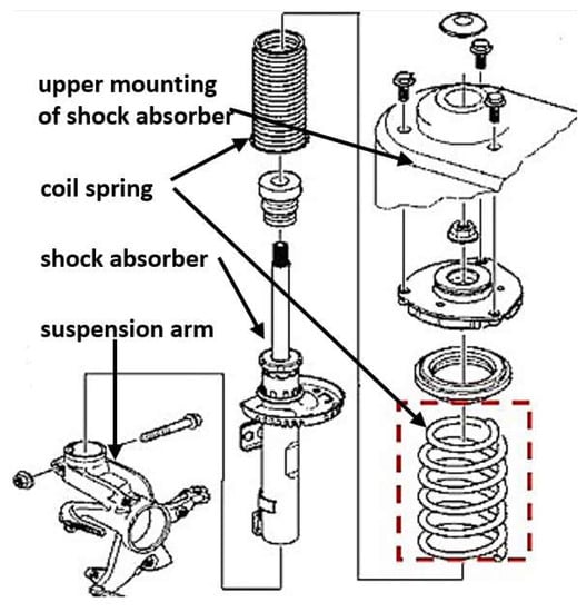Diagram of the front suspension system with replacing coil spring (objects of investigation) [41].