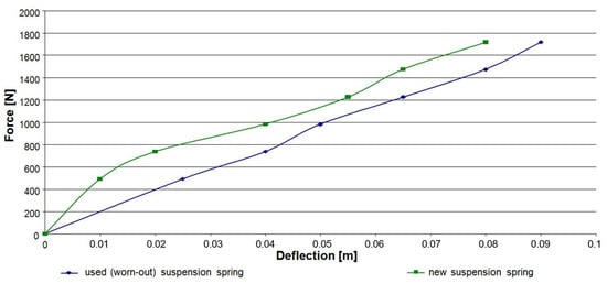 The properties of coil springs change due to the operating period. It was assumed that the main factor in vibration transfer related to the springs is time and condition of operation of the vehicle suspension. The experiments were carried out on a passenger car with a new and used (worn-out) suspension spring. The force vs. deflection characteristics of researching coil springs are presented in Figure 5. The influence of stiffness on the dynamic response of a mechanical system is also dependent on the initial static load of this system. In this case, the differences in the vibrations transmitted by such a system can be even more pronounced with a change of the spring and additional (extra) load. Therefore, during the research experiments, vibration recordings were carried out with an additional (extra) load on the test vehicle.