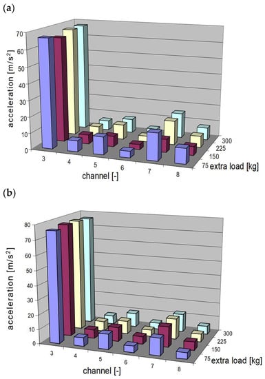 Even raw signals enabled precise observation and comparison of vibration time functions. Thus, the evaluation of exploitation parameters on the vehicle to propagate vibrations into vehicle structure is possible. For the preliminary analysis of the influence of the investigated parameters on the level of vibrations occurring in vehicle structure, the resonance windows were identified. According to mechanical vibration theory, the impact of mechanical system properties (e.g., stiffness) on the generation and propagation of vibrations is significant during the passing of resonance frequencies. The distribution of the maximum values of the vibration acceleration from suspensions with new and worn springs are depicted in Figure 7. These figures present complete results for the research with an additional (extra) load in the tested vehicle.