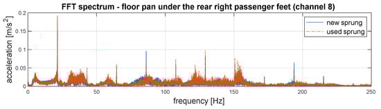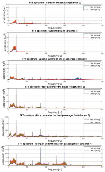 The analysis of vibrations in the resonance windows with maximum values can only be a preliminary observation. The distributions of the maximum values of vibrations recorded for the two different coil springs presented in Figure 7 show differences and some cognitive values, but they do not constitute valuable engineering knowledge. When assessing the impact on vibration comfort, extended analyses should be carried out, which will take into account measures of signal energy and frequency distribution. To analyse the frequency distribution of vibrations, a mathematical transformation of the time series into the frequency distribution should be performed. Fast Fourier Transform (FFT) is commonly used for this purpose.