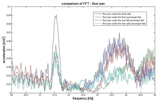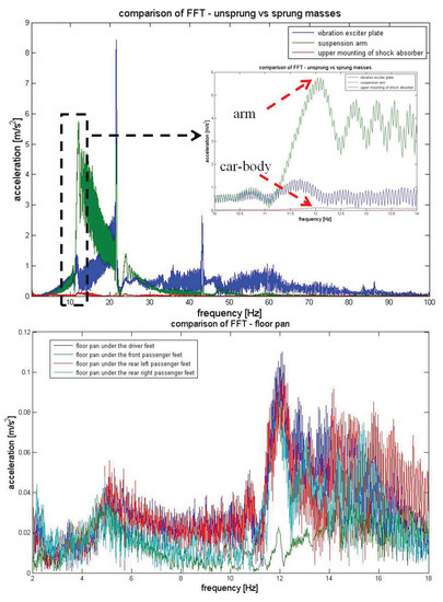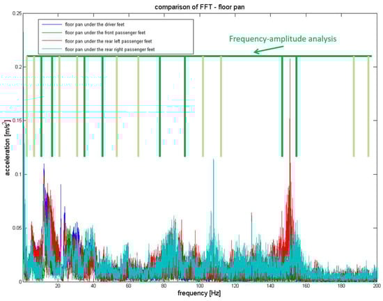 A certain novelty of the presented research is the analysis of the frequency structure of synchronously recorded vibrations on the vehicle floor in places where the vibrations penetrate the people in the vehicle through the feet. In addition, to analyse the vibration propagation, taking into account suspension parameters, vibration spectra were determined from the source of vibration through the suspension arm (representing the unsprung mass) and the upper shock absorber mounting, as the first point of the sprung mass. The sample results are shown in Figure 8.