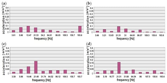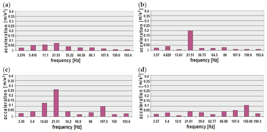 Distribution of maximum amplitudes of vibration signal spectra obtained for floor panel of passenger car for the selected characteristic frequencies (the vehicles with build-in used (worn-out) suspension spring): (a) driver’s feet resting spot, (b) front passenger’s feet resting spot, (c) rear left passenger’s feet resting spot, (d) rear right passenger’s feet resting spot.
