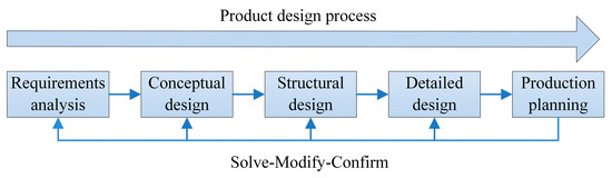 The product design process can usually be divided into five stages: requirements analysis, conceptual design, structural design, detailed design, and production planning [40], as shown in Figure 1.