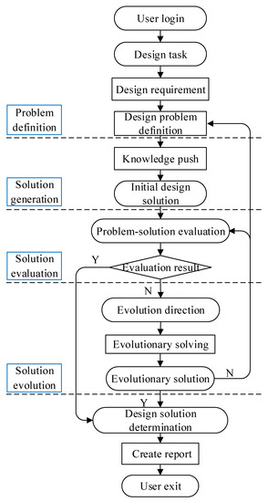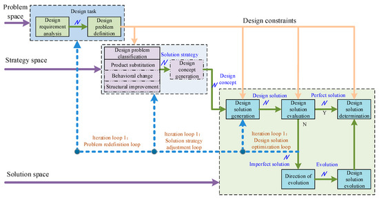 The product design process is not a simple serialization of these phases, there are intersections and iterations. Product design is a continuous iterative process from problem identification to solution generation, testing, modification, optimization, and determination. The designer usually proposes a solution concept for the design problem, and then uses the solution concept to further understand the design problem and explore a reasonable design solution, i.e., the problem and the solution in the design process are complementary and evolve synergistically [41]. In order to assist designers to clarify the mechanism of scheme evolution and realize product design solution evolution, a solution evolution process model based on design iteration is established in this paper, as shown in Figure 2. With the intervention of problem-solving strategies, design ideas change back and forth between design problems and design solutions, which promotes the simultaneous and interactive evolution of the understanding of design problems and the development of design solutions.