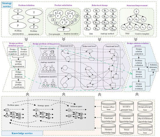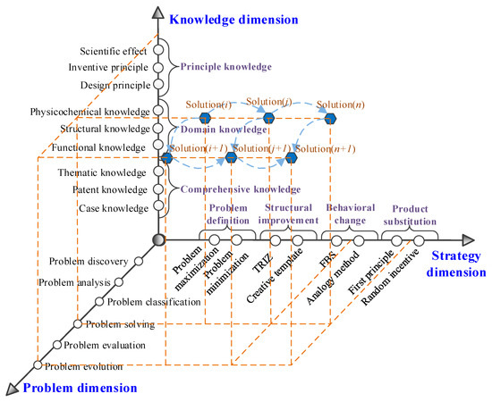 In the process of problem–solution co-evolution, the discovery, analysis, and definition of product design problems, the selection of design strategies, the solution of design problems, and the generation of design solutions all require knowledge support. Three conditions are necessary to realize the knowledge service for product design solution evolution [42]: (1) a complete problem-solving process; (2) appropriate design strategies and design methods to guide the designer’s creative thinking; and (3) appropriate knowledge resources to assist the designer in invoking the knowledge. Therefore, this paper constructs a product design solution evolution knowledge service framework in three dimensions: problem dimension, strategy dimension, and knowledge dimension, as shown in Figure 4.