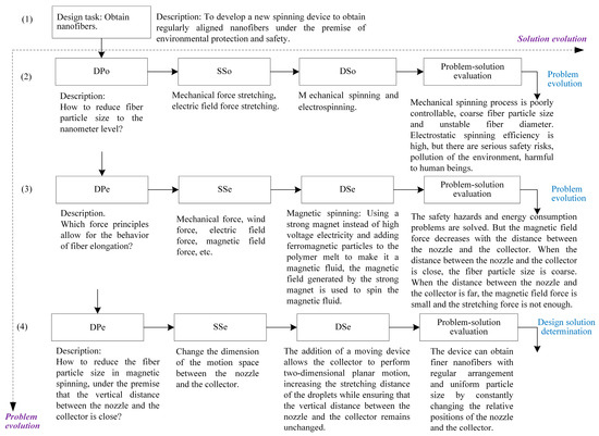 - Problem evolution: According to the problem evolution path (6) shown in Figure 3, the defects of the two initial solutions stem from their use of two different tensile principles of mechanical and electrostatic forces; to solve the various problems with mechanical and electrostatic spinning as the initial solution, it is necessary to change the tensile force principle of spinning. Therefore, the evolved design problem can be defined as “which force principle can achieve the behavior of fiber elongation”. According to the description of the strategy space in Figure 2, this problem is a behavior change problem.