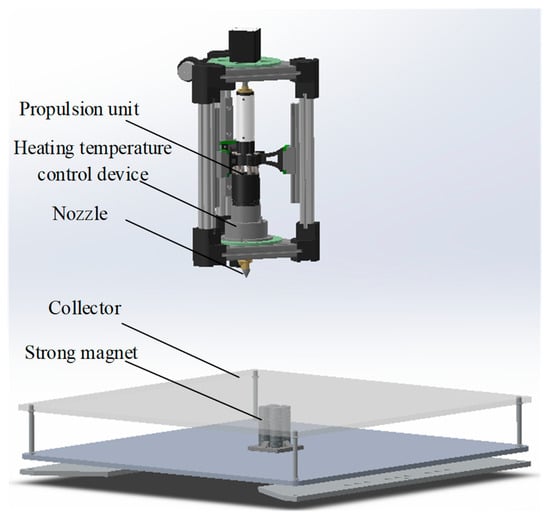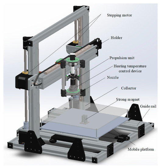 - Formation of the second evolution solution: According to the analysis of strategy dimension in Figure 4, the structural improvement problem can be solved by the TRIZ theory with the creative template method. According to the analysis of the solution strategy in Figure 5, the TRIZ service strategy in the combination incentive strategy is proposed to be used to push the corresponding knowledge of invention principles and technical evolution theory. The structure of the existing spinning solution can be improved according to the pushed knowledge. According to the solution evolution path (1) shown in Figure 3, the contradictions of the existing magnetic spinning solution are analyzed: the distance between the collector and the nozzle is large, the magnetic field force is weak and cannot provide sufficient stretching force; the distance is small, the magnetic field is strong, but the stretching distance is not enough to obtain the nanoscale particle size. This is a typical set of technical conflicts, which can be solved with the help of the inventive principle in the TRIZ theory [14]. The specific steps are as follows: to ensure that the fiber particle size to nanometer, it must be made subject to the magnetic field force that has a large enough, “force” for the parameters to be improved, corresponding to the general technical parameters “10—force”. However, in order to increase the magnetic field force, the vertical spinning distance between the nozzle and the collector should be small enough, resulting in the deposition of droplets on the collector before they are stretched long enough from the nozzle, and the fiber particle size cannot reach the nanometer level. That is, the “droplet stretching length” becomes a deteriorating parameter, corresponding to the general technical parameter “3—length of the moving object”. After consulting the conflict matrix, we obtained 4 recommended inventive principles: 9 (pre-reaction), 17 (spatial dimensional change), 19 (periodic action), and 36 (phase change). After analysis and comparison, finally, the inventive principle 17 (spatial dimension change) was selected for the problem solution. This problem is solved by a three-dimensional movement between the magnetic fluid injection device and the collector. The addition of a moving device allows the collector to perform a two-dimensional planar motion, increasing the stretching distance of the droplets while ensuring that the vertical distance between the nozzle and the collector remains unchanged. The improved solution changes the original fixed magnetic spinning device into a three-dimensional magnetic spinning device that can move up and down, left and right, and back and forth, as shown in Figure 9.