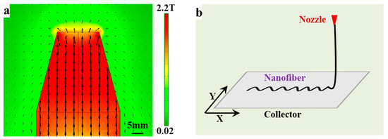 Polystyrene (PS, MW = 200 kDa) was chosen as spinning material; the average size of Fe3O4 nanoparticles was 50 nm and the blending ratio of Fe3O4 in PS nanofiber was set as 5%. The nanofibers were prepared through the customized magnetic spinning device, as shown in Figure 9. Comsol simulation was applied to calculate the magnetic field in Figure 10a, which indicated that a magnetic field of 0.02–2.1 T was generated around the surrounding area. The magnetic field exceeded 1.6 T in the range of 5 mm around the nozzle, where magnetic spinning occurred [48].