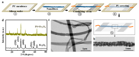 (a) Schematic depiction of the fabricating process of strain sensor with nanofiber strips. (b) Optical image of fibrous strips from magnetic spinning. (c) TEM image of PS@Fe3O4 nanofibers. (d) XRD patterns of PS and PS- Fe3O4 composite nanofibers.