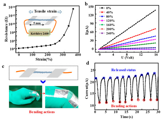 Figure 12b shows the I–V characteristics of fibrous sensors with different uniaxial strains. The electric current strengths decreased gradually with the strain varying from 0 to 240%, but the resistance of the sensor indicated no change at the same strains. The electrical resistance of highly aligned fiber arrays was only sensitive within limited strains and fluctuations of resistances were observed as strain beyond the limits [53]. Here, the fibrous strips with curved morphology could bear strains of 240% without breaking and achieve better resistance stability under strains.