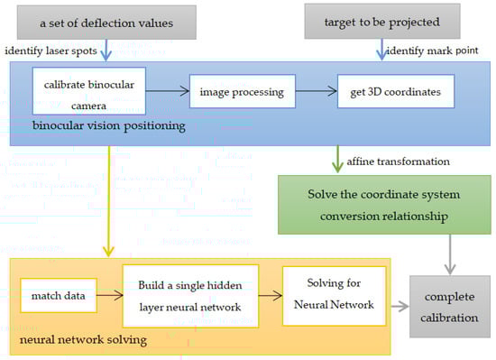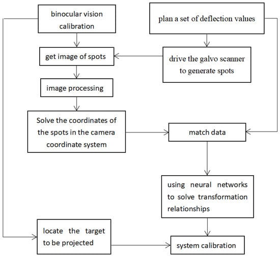- Steps one and two are repeated to obtain the 3D coordinates of multiple groups of different outgoing laser spots and matching deflection values of the galvo scanner. The neural network is used to solve the relationship between the coordinates of the camera coordinate system and deflection values of the galvanometer.