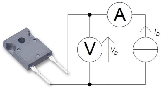 The temperature of the diode case Tc is dependent on the junction temperature Tj. In turn, Tj depends on the power dissipated in the junction Pj. A silicon carbide Schottky diode, FFSH10120A (Onsemi, Phoenix, AZ, USA) (IF = 10 A, VF = 1.5 V), placed in a TO-247 case was selected for this research. The view of the diode and the external dimensions of the TO-247 case are shown in Refs. [26,27].