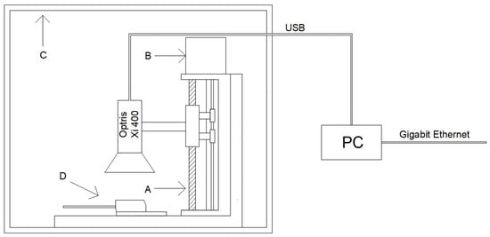 Measurement system with Optris Xi400 camera and FFSH10120A diode: (A) tripod; (B) stepper motor; (C) chamber made of black foam made of polyurethane; (D) the observed semiconductor element.