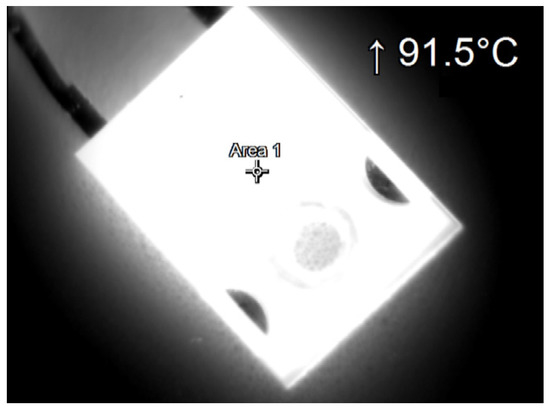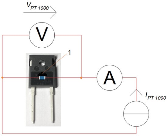 The measurement system prepared in this way made it possible to carry out research work, the result of which was the determination of the value of ε of the mold body [30]. For this purpose, a PT 1000 temperature sensor placed in an SMD 0603 case (Heraeus, Hanau, Germany) [31] was attached to the mold body of the FFSH10120A diode case [32]. The sensor was glued to the diode case. The WLK 5 glue (Fischer Elektronik, Lüdenscheid, Germany) with a known value of thermal conductivity k (k = 0.836 W/m·K) was used to stick the sensor to the case. The mold body was marked with a marker made of Velvet Coating 811-21 paint with a known emissivity coefficient value e ranging from 0.970 to 0.975 for temperatures within the limit of −36 °C to 82 °C. The uncertainty with which the value of the emissivity coefficient value was determined was 0.004. Figure 3 shows the placement of the PT 1000 sensor and the Velvet Coating 811-21 paint marker.