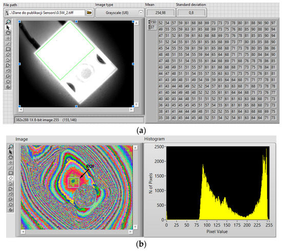 The created program is adapted to process files of typical formats such as BMP, TIFF, JPEG, PNG, etc. LabVIEW, using the IMAQ Create library, creates a temporary location in the computer’s memory for image processing. After the image is loaded, the pixels are automatically converted to the format set by the user. The paper presents the results after the conversion to a monochrome unsigned 8-bit format. The pixel color obtained in this way ranges from 0 to 255, with 0 being black and 255 being white. The image created as a result of the conversion is the so-called reference image [45,46].