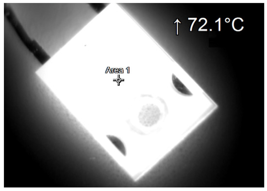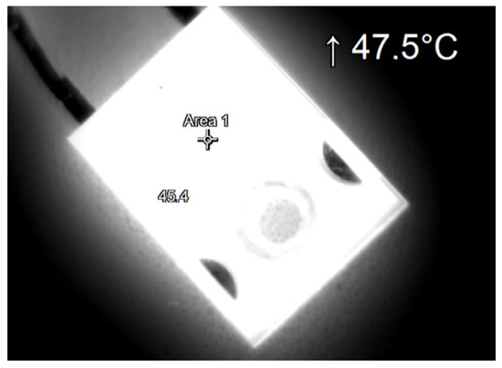On the basis of the conducted works, it was found that the smallest differences between the die temperature and the case temperature occur at point 5 for the model shown in Figure 18, and this is a spot on the mold body surface above the die. In the remaining points, the differences are greater, with the largest ones in point 4 of this model. The proposed method makes it possible to automate the determination of the area on the case surface of a semiconductor element where the temperature recorded by thermography is the highest. This method can be particularly useful when assessing the temperature of semiconductors based on thermographic measurements of moving elements. In this case, the time to determine the area with the highest temperature is the shortest, and the precision of this determination the highest.