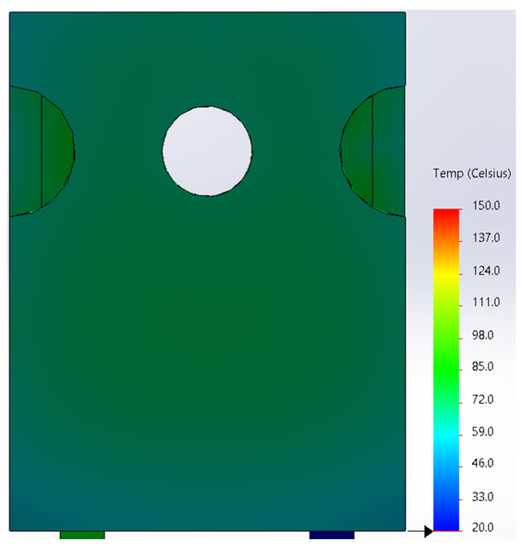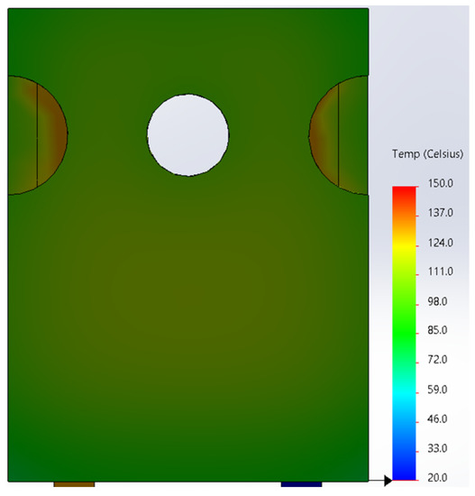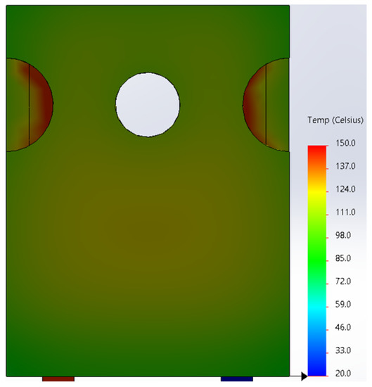 Based on the knowledge of the parameters related to the construction of the tested diode, its model was developed in SolidWorks. On this basis, the thermal simulations were performed for all values of the power dissipated in the die Pj, for which the thermographic measurements were taken earlier. The temperature distributions obtained as a result of the simulations are shown in Figure 12, Figure 13, Figure 14, Figure 15, Figure 16 and Figure 17.