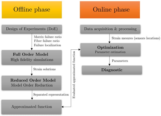 However, when the chosen parameters are associated with the localization of the damage to the structure, the sPGD method is not accurate enough to provide valuable predictions. This is because the solutions are strongly influenced by the localization of the damage. To overcome this difficulty, we propose an adaptive sPGD using a change of variable in the parameters’ definition and an adapted interpolation procedure. Figure 1 presents the proposed SHM methodology relying on an offline/online strategy. In the offline phase, by the use of a consistent DoE and an adaptive sPGD method, a parametric solution of unidirectional fiber and matrix failure ratios and their localization on the structure is expressed. Then, in the online use, the parametric solution is combined with optimization methods to find the model parameters from measured data through a sensor network. By defining damage-related parameters in the dataset, such as fiber and matrix failure ratios and damage localization, the health state of the structure is determined.