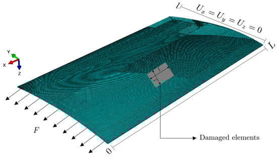 In the present case study, to demonstrate our methodology, four parameters related to damage were considered. The aim of the SHM framework consists of the detection, localization and characterization of damage. For that purpose, we considered the damage model presented in Section 2.2 combined with the FE solver to emulate a damage on the blade. That damage led to a stiffness reduction at a certain location of the structure. Two parameters were chosen to demonstrate the proposed methodology and characterize the damage severity, and , respectively. In our structure, the FOD panel was subjected to a longitudinal tensile force. The most likely initial failure in this configuration is a fiber failure and it can be followed by other failure mechanics such as a matrix failure. Finally, in order to assess the localization of the damage on the structure, two other parameters characterized the damage location, and . The size of the damage () was constant in our study. That is, once the FE model was created, the damage variables became parametric.