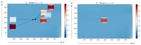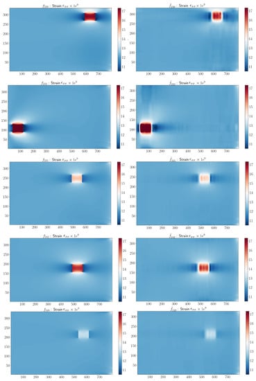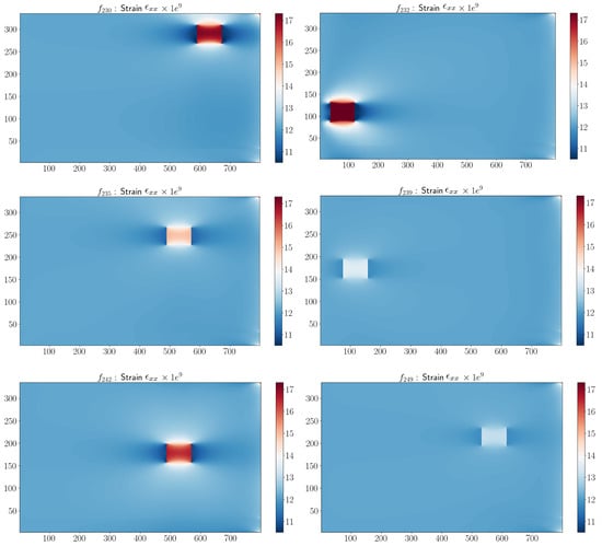 The FE model was applied using the high-fidelity solver in Abaqus software for damaged configurations according to the DoE. To demonstrate the ability of the method to reconstruct different types of damage on the structure, we chose to show six simulations in the test database. For each of them, the damage was observed in the area with the maximum strain. Figure 4 shows the -component of the strain on the top-view xy-plane for the damage configurations reported in Table 3.