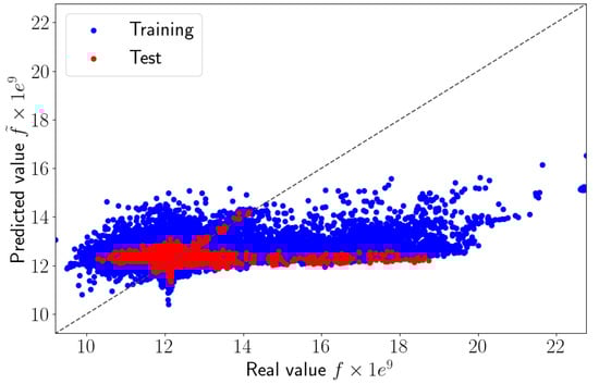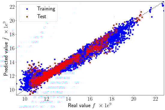 We applied the sPGD methodology presented in Section 2.3.2 using a classical polynomial basis. modes were used, and the training dataset was comprised of the first 230 high-fidelity solutions and the test dataset of the last 20 high-fidelity solutions. To train the model, we used 1728 elements of the 2D model presented in Figure 4. Figure 5 compares the reference solution f and the values predicted using the sPGD regression using a polynomial basis . The blue and red points represent the training and test dataset, respectively, in the parametric domain.