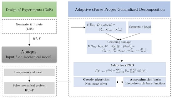 Consider a new function that we are trying to approximate that depends on different dimensions in the new parameter space , where S is the element id of the considered mesh in Section 2.3.4. The sampling presented in Section 2.3 was used. The vector output was expressed as = . The first four functions were approximated using piecewise functions, while the functions involving element ids were functions of a discrete variable. Figure 7 presents the adaptive sPGD methodology. In the first part, high-fidelity simulations were computed using the DoE, then centered and approximated as a function using a greedy algorithm and a piecewise cubic approximation basis.