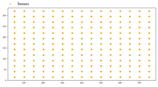 In structural health monitoring settings, the problem of structural parameter estimation from measurements collected by only a few sensors is a well-known challenge. By using the offline parametric database proposed in Section 2, the objective was to solve an inverse problem. An inverse problem describes how knowledge about a parameterized physical system can be obtained from experimental data, that is, the relationships between model parameters and data. For that purpose and for the sake of simplicity, we assumed that the experimental data were computed numerically and collected in a set of points; the sensor locations are shown in Figure 11 in orange and correspond to some elements , with k the sensor set. All measured data were stored in a scalar form in the vector . Thus, the optimization problem was: