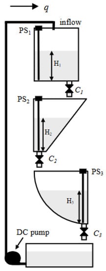 The objective of controlling the system of interconnected tanks was to maintain the liquid level in the middle tank at the reference level equal to = 0.25 m (see Figure 3). For this reason, we assumed appropriate parameters represented by , , (valve settings can be found in Appendix A), whereas pump flow q was the variable in the control process. Therefore, depending on the type of control used, different settings were adopted.