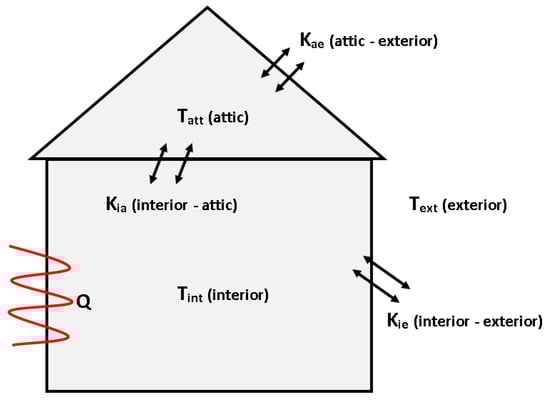 The second system presented in this paper is a thermal object in the form of a house (see Figure 2). The plant consists of two stories of different sizes, heat capacity, and heat loss coefficients between the system elements, the dynamic of which is described by the following differential Equations [,,,,]: