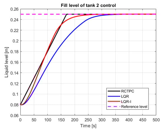 The simulation studies of stabilization of the liquid height of the second tank have been performed for each of the introduced approaches. Some of the results for the time domain plot are presented in Figure 4, while the used quality criteria are analyzed in the next section.