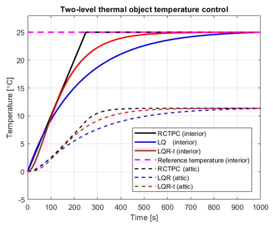 The purpose of controlling a two-level thermal object was a obtaining the indoor room temperature at a value of = 25 °C. For this reason, the appropriate heat power had to be selected. As it results from the characteristics of the room (see Figure 5), the whole heating process has an effect on the attic temperature, which on the other hand, has an effect on the temperature being regulated in the internal room. For simulation studies, it has been assumed that the temperature of both rooms has an initial value = 0 °C. Meanwhile, a disturbance of the control process is the external temperature of the system with the value = 0 °C.
