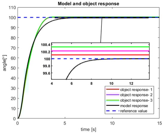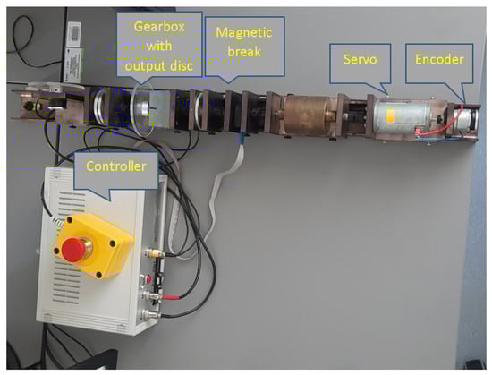 Furthermore, the similar structures, connected with the control of the DC motor, can be found in [,] or by using the Extended State Observer (ESO) for different objects in [,,]. In these cases, special attention has been paid to the fact that measurement issues play a large role in the context of proper sensor selection or its location [,,,,,,,,,,,]. This article is no different; sensors are important elements which play an important role in the context of the new control law. The encoders used in the research object to measure the speed and position values are the incremental ones with 4096 pulses per rotation. Nevertheless, in the case of using lower resolution sensors, some solutions can be found in [].