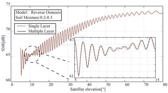 The outcomes of the comparison between the single-layer and multi-layer models are shown in Figure 3. In contrast to the multi-layer model, the single-layer model only has one “notch” in the SNR of the interference signal. With the aid of the vertical polarization’s total transmission characteristic, it is possible to measure the soil moisture with a depth gradient.
