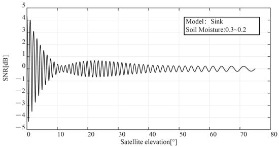 The interference signal’s SNR oscillation waveform, which was captured using a vertically linearly polarized GNSS antenna, is shown in Figure 2. The simulation is set to sink mode, and a 20 cm layer of soil moisture is lowered from 30% to 20%. In Figure 2, there is a “notch” where the satellite elevation angle is 15°, with its amplitude significantly decreasing in comparison to other height angles. The larger portion of Figure 2 demonstrates the presence of three distinct frequency components relating to the satellite’s elevation angle at the problem location. The expanded portion of the picture demonstrates that there are three distinct frequency components related to the satellite’s elevation angle at the defect site.