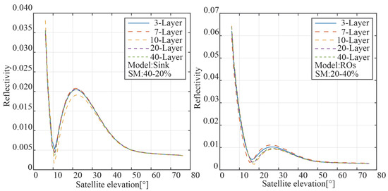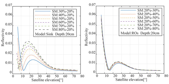 Figure 5 displays the reflectivity results for the two modalities; the right panel displays the results from reverse osmosis, while the left panel displays the results from the sink model. When the satellite elevation angle is high, the top layer of soil reflects the majority of the GNSS signal, according to the sink model. The interference signal presents the “notch” position between 10° and 20° of the satellite elevation angle as the enlarged part of Figure 2 shown. The left panel demonstrates that the peak of reflectance also increases in size the lower the satellite elevation angle is when the full transition occurs and the soil surface moisture is higher. Additionally, the rise in the peak of power reflectivity steadily diminishes as the surface soil moisture increases. We simply modified the bottom soil moisture when modeling the reverse osmosis model, leaving the soil top moisture untouched. The right panel, for instance, demonstrates that altering the soil’s moisture content has no impact on the trend of reflectance with satellite elevation angle. This is due to the fact that the moisture of the topsoil has a greater impact on the signal attenuation and overall intensity of the reflected signal than the moisture of the bottom soil.