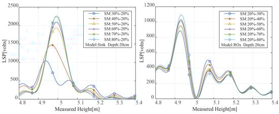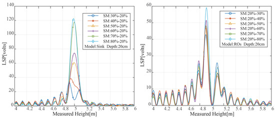 Multiple reflective surfaces exist in soil with unequal water distribution, creating several reflecting signals. The peak value and peak position of the LSP spectrum of the reflected signal are variable as a result of the varying distance between the reflecting surface and the soil surface. The results of the LSP spectrum estimate for various SMC variation ranges under two distinct modes are shown in Figure 6. Figure 6’s SMC distributions all exhibit multi-peak properties. The maximum peak power rose with the rise in surface SMC when the soil was in sink mode, and the moisture on the soil surface was higher than that at the bottom. The maximum peak power rose with the rise in surface SMC when the soil was in sink mode, and the moisture on the soil surface was higher than that at the bottom. The moisture on the soil top was lower when the soil was in the reverse osmosis mode than it was at the bottom, and the position of the greatest peak power relative to the measured height was also diminished. Additionally, the fraction of electromagnetic wave transmission was decreased, and the power to reach the second layer was decreased, according to Equation (6). As a result, the peak power was drastically decreased.