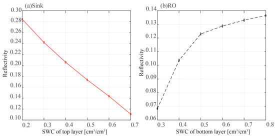 According to the sink model, when SMC in the first layer rises, the strength of the signal transmitted into the second layer falls and the reflectivity of the second layer also decreases. In the reverse osmosis model, when the bottom SMC rises, the second layer of the soil’s SMC rises as well, increasing reflectivity. Furthermore, the second layer of the soil’s reflectivity tends to stabilize as the bottom SMC rises.