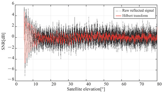 According to Figure 9, there are several burrs in the time series of the interference signal SNR after the addition of Gaussian white noise, which will impair the measurement of the notch of the vertical signal transmission. In this work, the interference signal’s envelope is obtained using the Hilbert transform to lessen the impact of burr. Hilbert transforms take the unprocessed signal as: