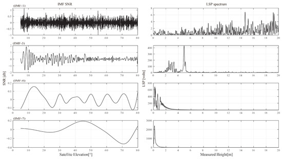 The high-frequency components of the interference signal will be present given the presence of noise. In this study, distinct frequency components are extracted and high-frequency components are eliminated using the empirical mode decomposition (EMD) approach. EMD breaks down the signal into a number of intrinsic mode functions based on the time scale of the local aspects of the signal (IMF). The results of the EMD decomposition and its spectral properties are shown in Figure 10. The 4 panels on the right represent the matching spectrum, while the 4 panels on the left represent the IMF1, 3, 6, and 7 components. The spectrum shows that IMF1’s high-frequency component includes a large number of spectral peaks. Low-frequency components include IM3, 6, and 7, of which IMF6 and 7 should be direct current (DC) components due to their lower frequencies. IMF3’s spectrum peak emerges at 5 m which shows that the soil surface is where the GNSS signal for this component is reflected. Additionally, other IMF components did not exhibit spectral peaks at approximately 5 m, and the SNR of the IMF3 exhibits a “notch” when the satellite elevation angle is around 18°.
