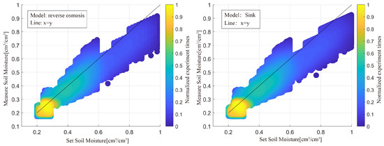 We set the minimum humidity at 20% cm3/cm3 and increase it by 1% cm3/cm3; the maximum humidity is 80% cm3/cm3, and increases by 1% cm3/cm3. Each group is simulated 1000 times, and the results are displayed in Figure 12. The reverse osmosis model is on the left, and the sink model is on the right; together they represent the scatter plot of set soil moisture and the results obtained by the model suggested in this study for the two modes. The results of the measurements are somewhat lower than the predetermined soil moisture, according to both models. Additionally, when SMC increased, the relationship between the set SMC and the retrieved results was less correlated. This is due to the fact that when SMC rises, the GNSS signal’s attenuation when passing through soil rises and the accuracy of data processing reduces.